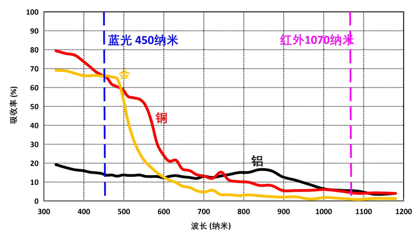 金、銅、鋁對(duì)不同波長(zhǎng)激光的吸收率曲線