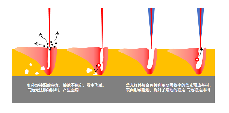 我們的藍(lán)光-紅外復(fù)合激光焊接方案在紅外光斑外部疊加藍(lán)光光斑,改進(jìn)焊接溫度場(chǎng)。利用低亮度,高吸收的藍(lán)光加熱基材,在其表面形成融池。提升熔池的穩(wěn)定性,基本消除焊接過程的飛濺、空洞,焊縫外觀光滑平整。