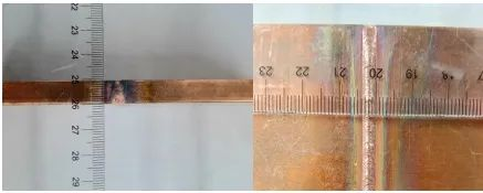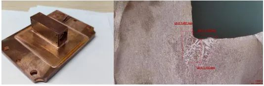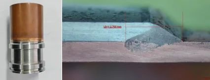 Figure 6: The hybrid laser is used for thick copper welding. The left figure is the thickness measurement diagram, and the right figure is the appearance diagram of the weld.