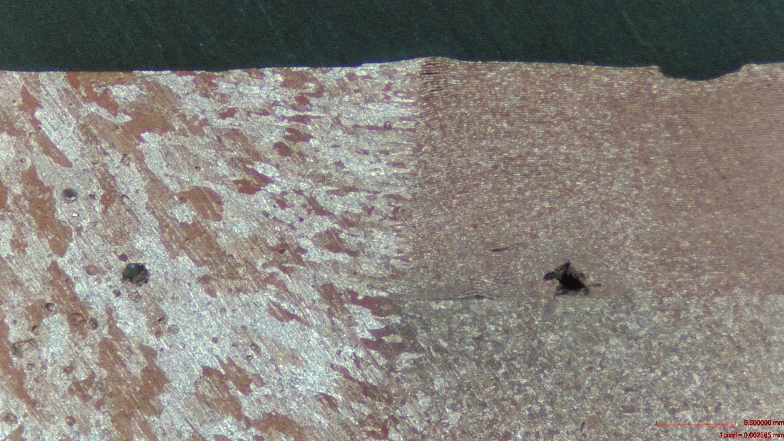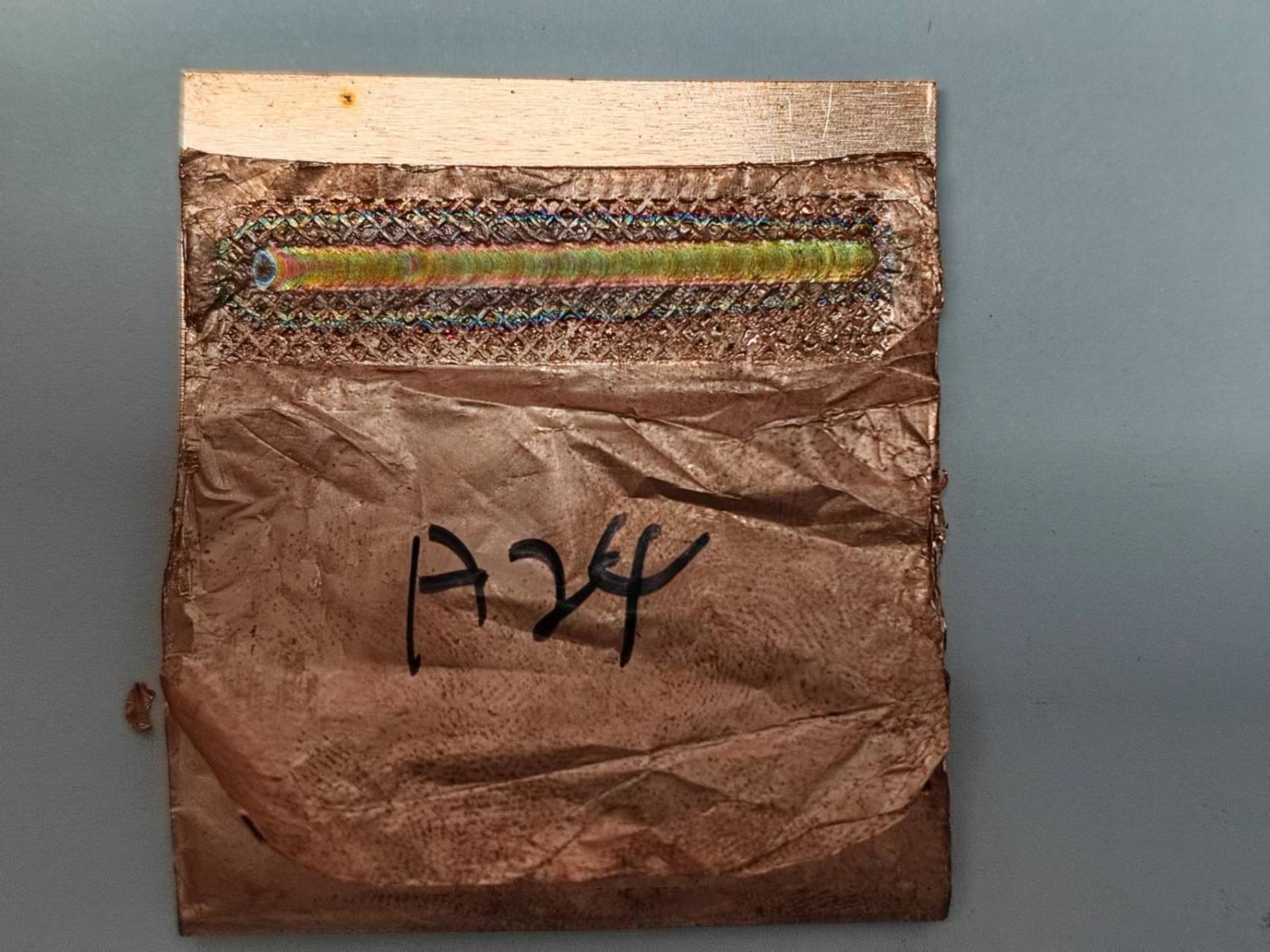 使用藍(lán)紅復(fù)合激光對(duì)銅/鋁箔材進(jìn)行激光焊接時(shí),利用外圈的藍(lán)光對(duì)銅快速預(yù)熱,形成表面熔池,提高其對(duì)內(nèi)圈紅外激光的吸收率。大幅降低銅從固態(tài)到液態(tài)時(shí),紅外激光吸收率的突變。從而使得焊接過程更加穩(wěn)定,無飛濺產(chǎn)生。同時(shí),使焊縫表面光滑平整,焊縫內(nèi)部無氣孔產(chǎn)生。